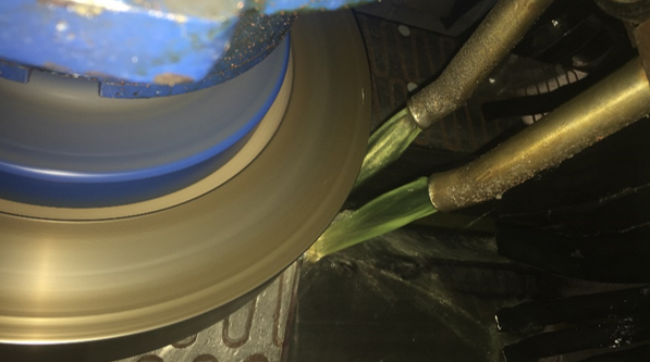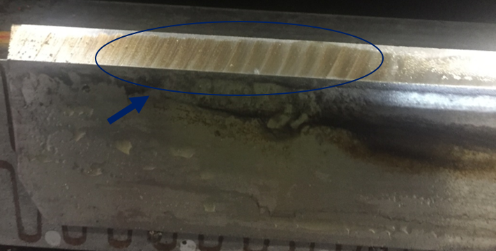 O sobreaquecimento da faca, que tem alta dureza, ocasiona queima do fio (conforme indicado na foto abaixo) que acarreta a alteração da microestrutura do aço e o surgimento de trincas.