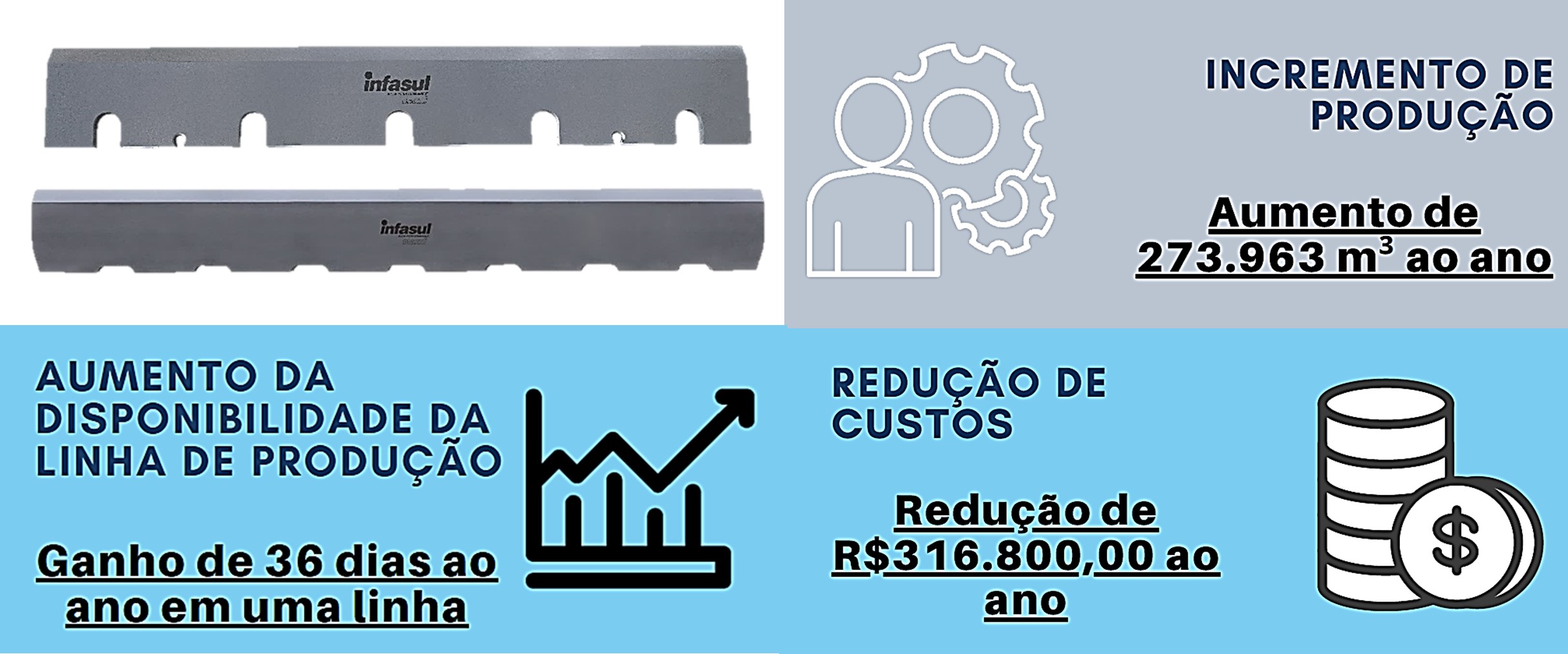 Além desta importante vantagem operacional, o desgaste das facas MAXXI foram 40% menores na reafiação. Abaixo, veja outros ganhos auferidos durante os testes: